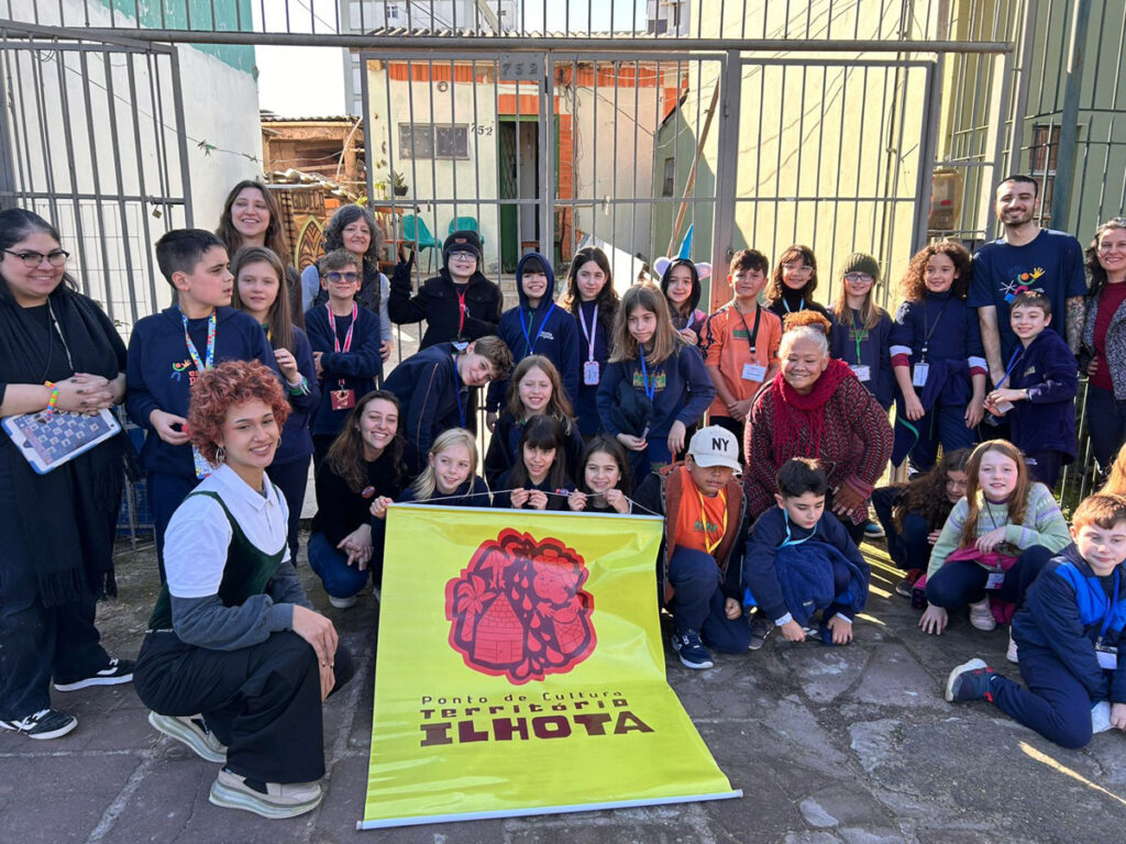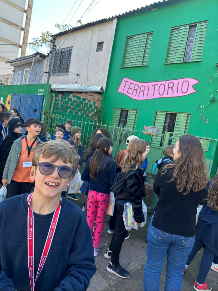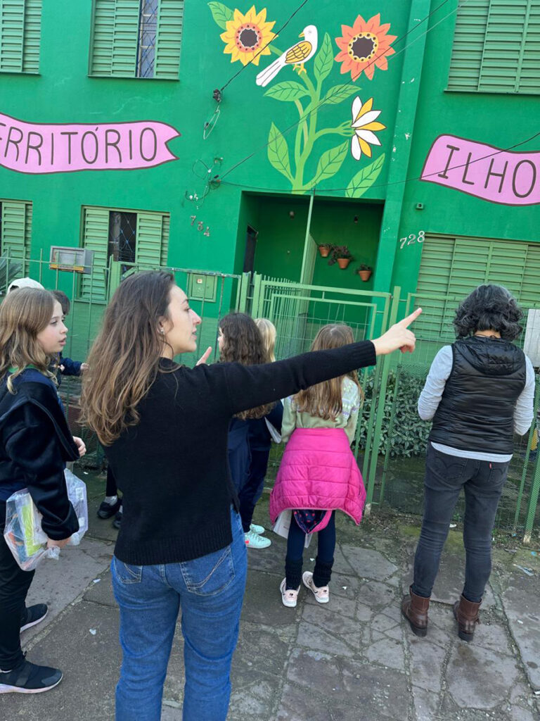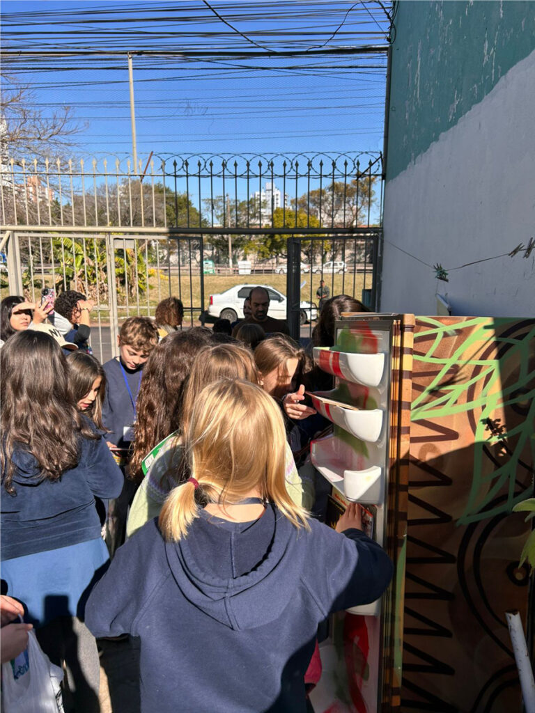 Depois da pintura, com acompanhamento do 5º ano, pelo grafiteiro Guilherme Menezes e Adriano Dplay, produtor cultural e ativista social, as turmas 42 e 43, que fizeram uma pesquisa sobre as Bibliotecas Comunitárias, em Porto Alegre e região metropolitana, entregaram a Geloteca para a comunidade da Ilhota, vizinha da escola, cheinha de livros.