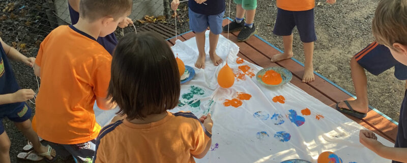 As crianças divertiram-se ao pintar com balões de água pendurados em um barbante.A proposta tinha como objetivo incentivá-las a experimentar, observar as marcas e explorar as misturas de cores.