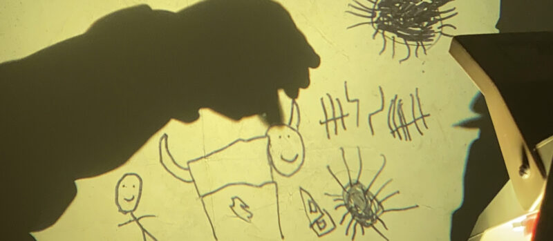 Um retroprojetor, um papel celofane e uma caneta preta proporcionaram às crianças a experiência de desenhar e, ao mesmo tempo, ver seus desenhos projetados e ampliados na parede. Elas também se divertiram ao observar e adivinhar as criações dos colegas!