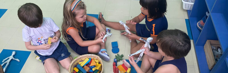 Para auxiliar na percepção do corpo humano, convidamos as crianças a construírem palitoches de si mesmas e bonecos com papel alumínio. Depois, divertiram-se muito com as brincadeiras!