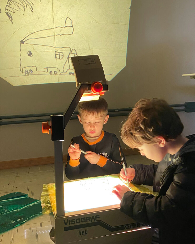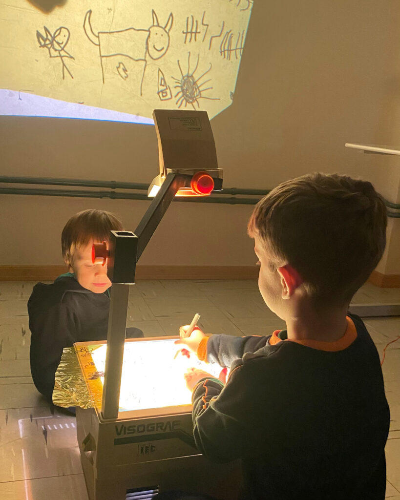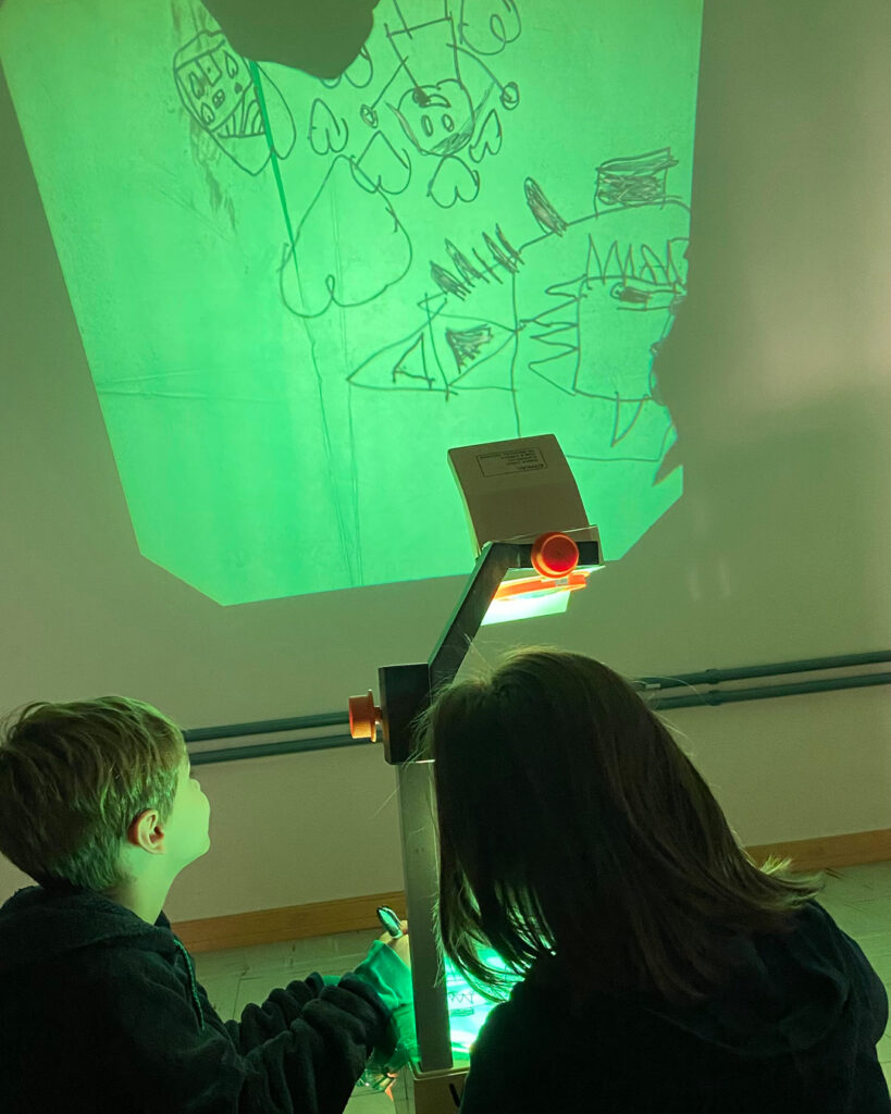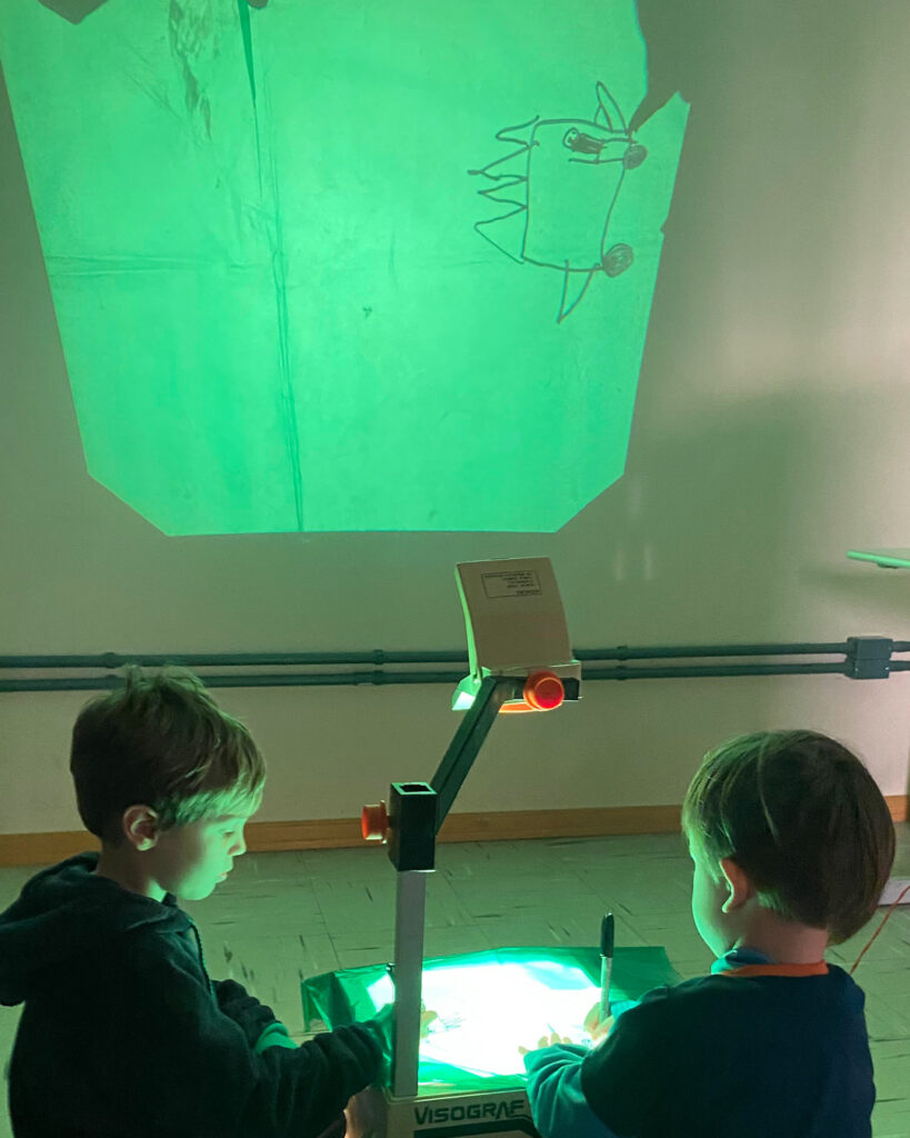 Um retroprojetor, um papel celofane e uma caneta preta proporcionaram às crianças a experiência de desenhar e, ao mesmo tempo, ver seus desenhos projetados e ampliados na parede. Elas também se divertiram ao observar e adivinhar as criações dos colegas!