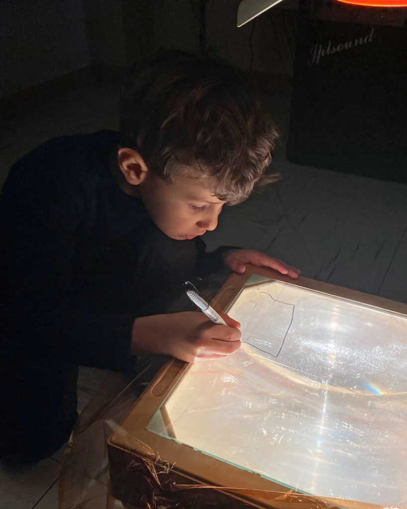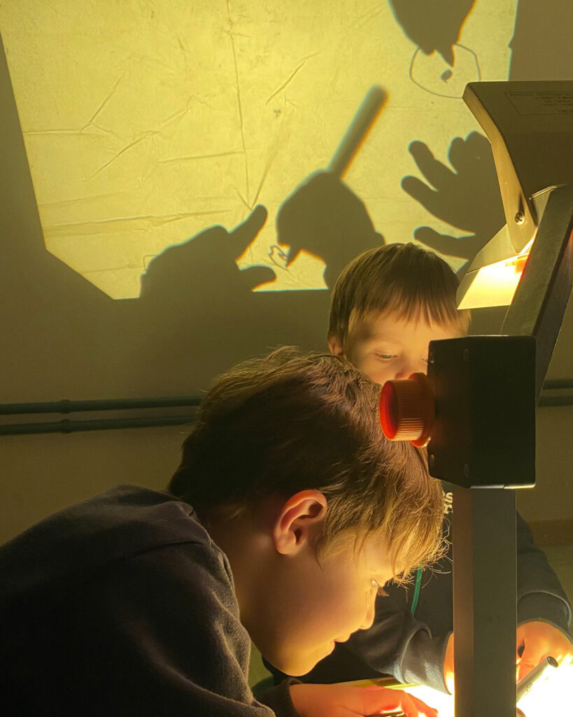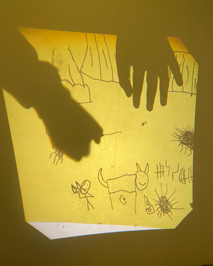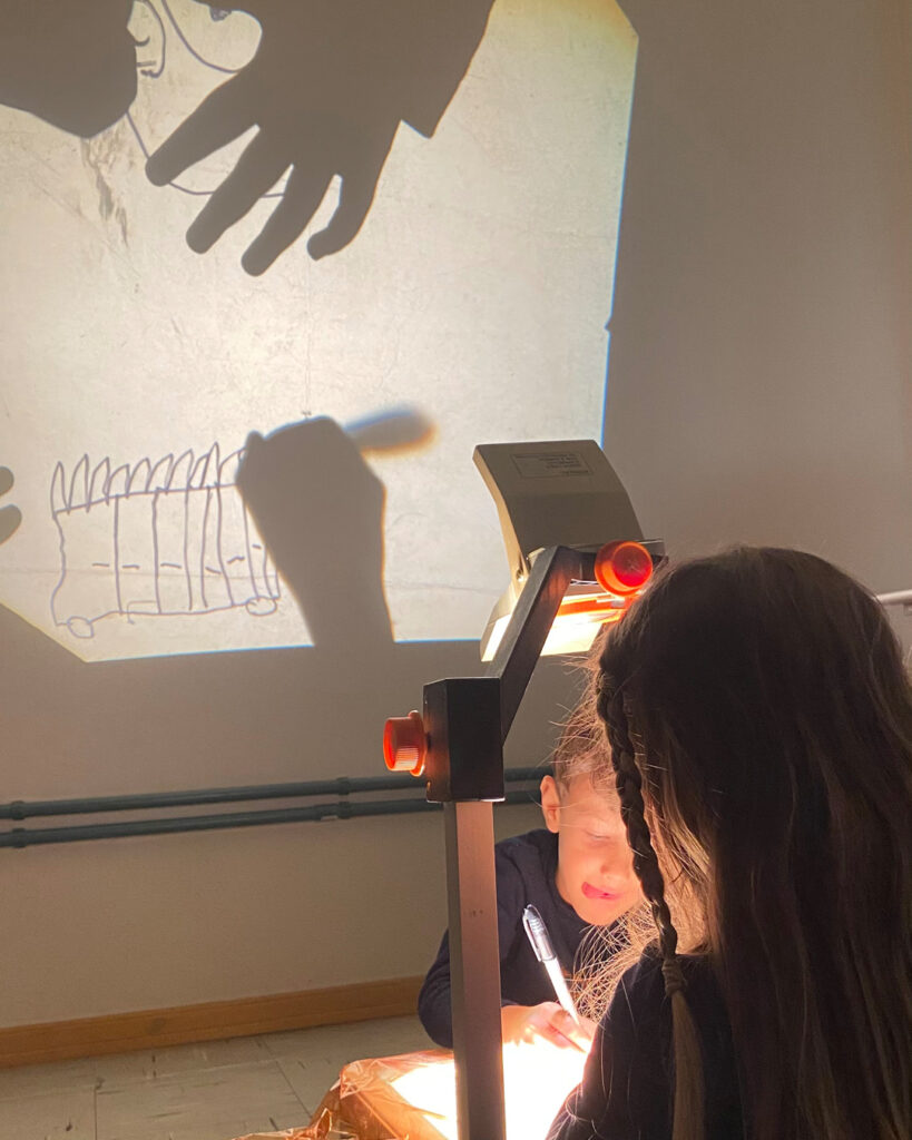 Um retroprojetor, um papel celofane e uma caneta preta proporcionaram às crianças a experiência de desenhar e, ao mesmo tempo, ver seus desenhos projetados e ampliados na parede. Elas também se divertiram ao observar e adivinhar as criações dos colegas!