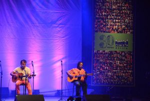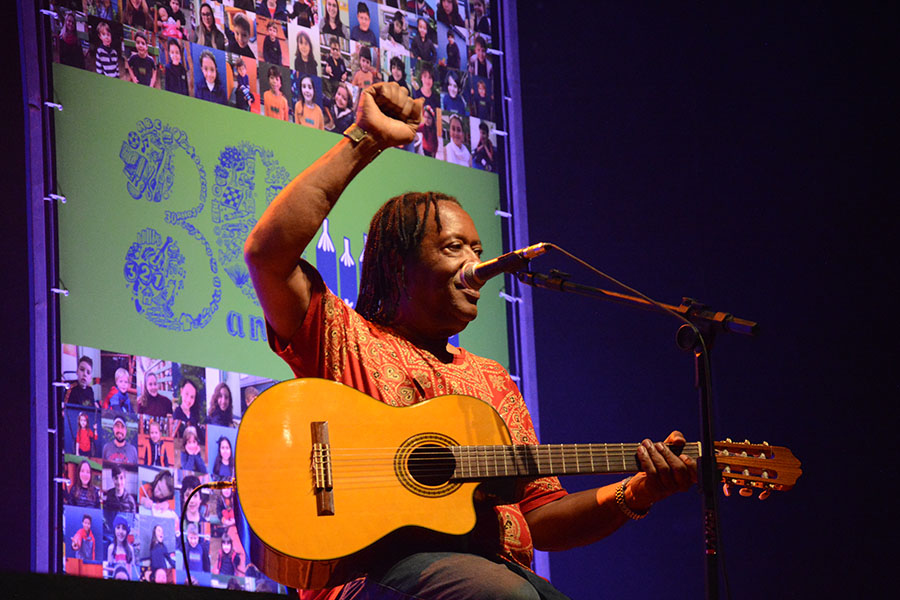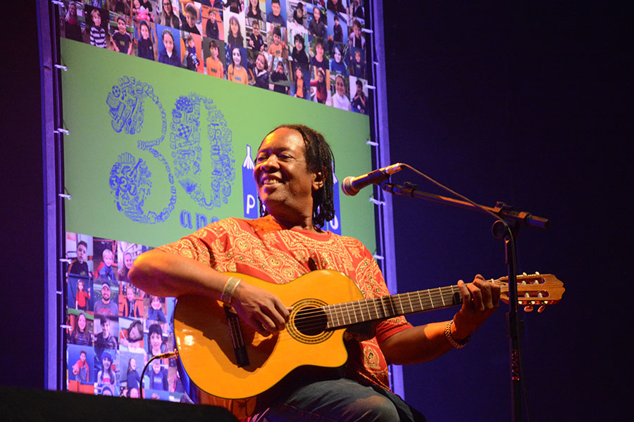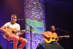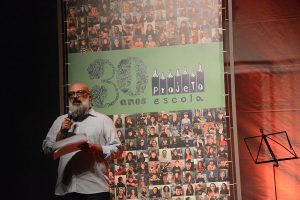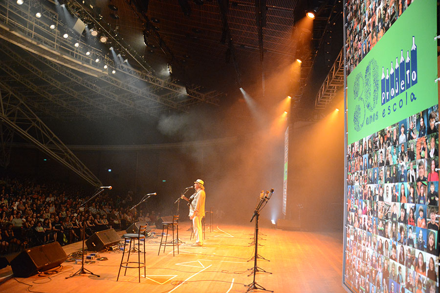 Tivemos conosco músicos (e musicista) estudados(a) pelos alunos e alunas nesses anos de Projeto, além de alguns outros convidados: Hique Gomez, Arthur de Faria, Chico Saratt, Nei Lisboa, Gustavo Finkler, Nelson Coelho de Castro, Claudio Levitan, Bebeto Alves, Leo Henkin, Marcelo Delacroix, Tiago Flores com um grupo do projeto Ouviravida e Lucas Kinoshita, Gelson Oliveira com o coro infantil da Escola Projeto, coordenado por Mari Castro, Pedro Borghetti representando seu pai Renato Borghetti, com crianças da Fábrica de Gaiteiros, mais Zelito Ramos e Renatinho Muller, Antonio Villeroy, Monica Tomasi, Vitor Ramil com alunos de 3º e 4º ano da Projeto, além de Nina Nicolaiewsky, filha do Nico, e Edu do Nascimento, filho do Giba Giba, com Richard Serraria. Ah, e teve também a participação especial dos nossos professores-músicos – Helena Lopes, Simone Rasslan, Mauricio Nader e Ianes Coelho – e do Grupo Sol de Si, grupo de canto da Escola Projeto, coordenado pelo Marcelo, que deram um show de classe e musicalidade.