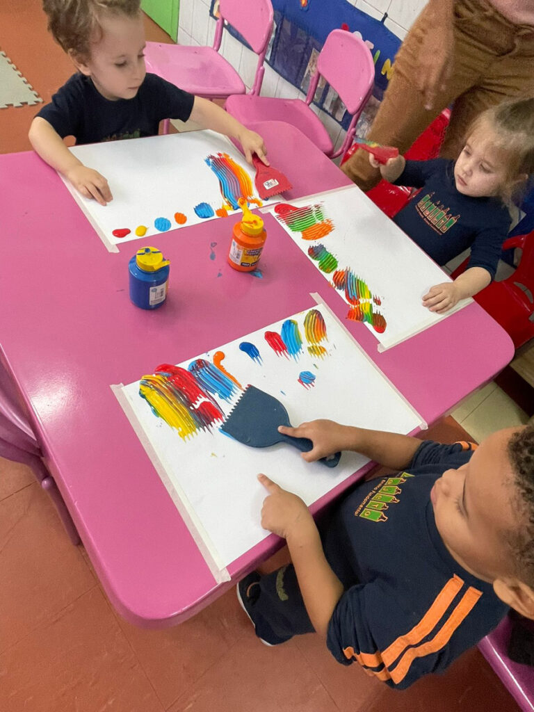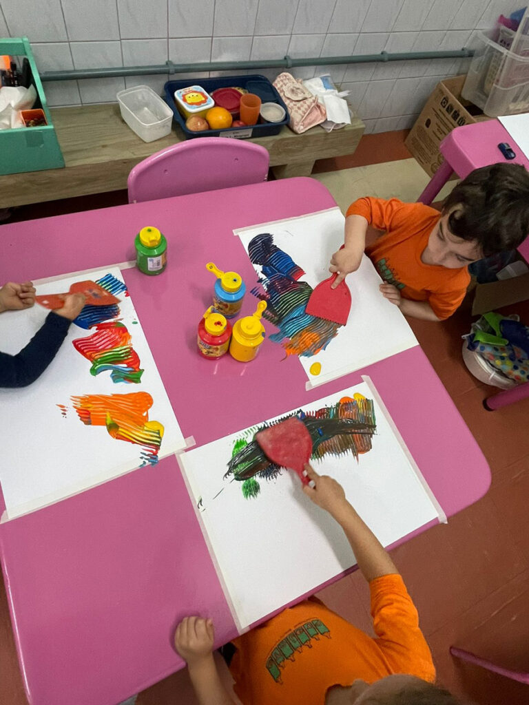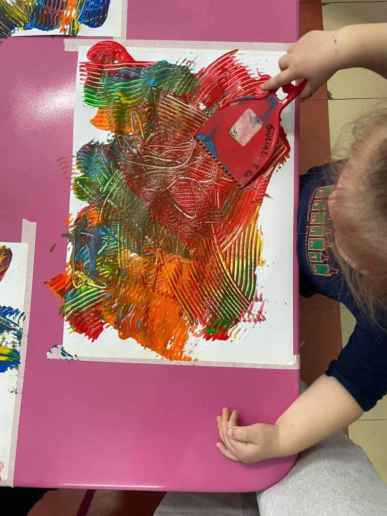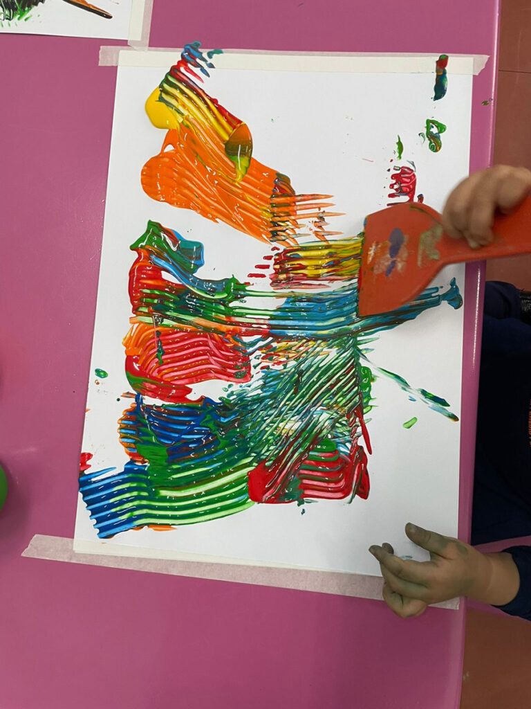 Nesta proposta as crianças conversaram sobre as cores e manipularam materiais que possibilitaram a sobreposição das tintas e o encontro das cores. Com o movimento de puxar a tinta, foram demonstrando encantamento com suas próprias produções.