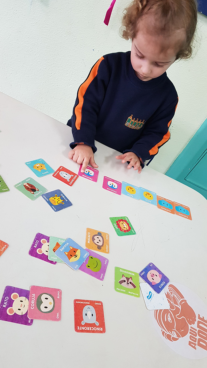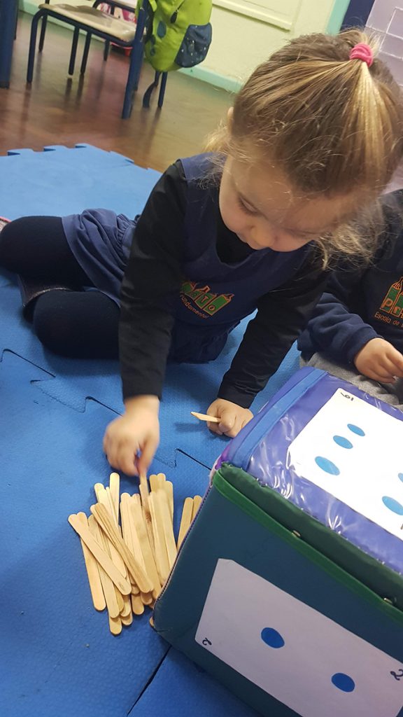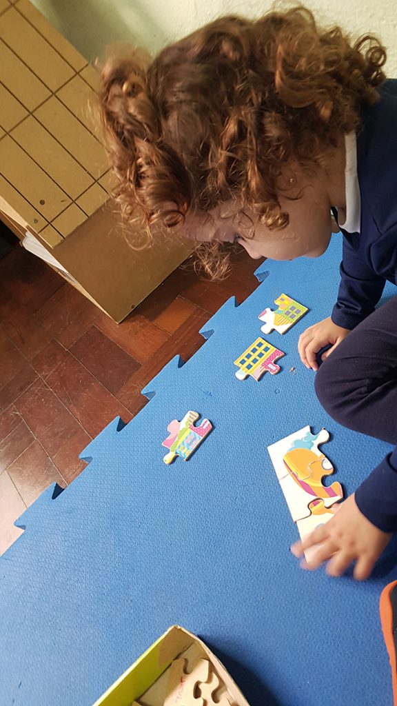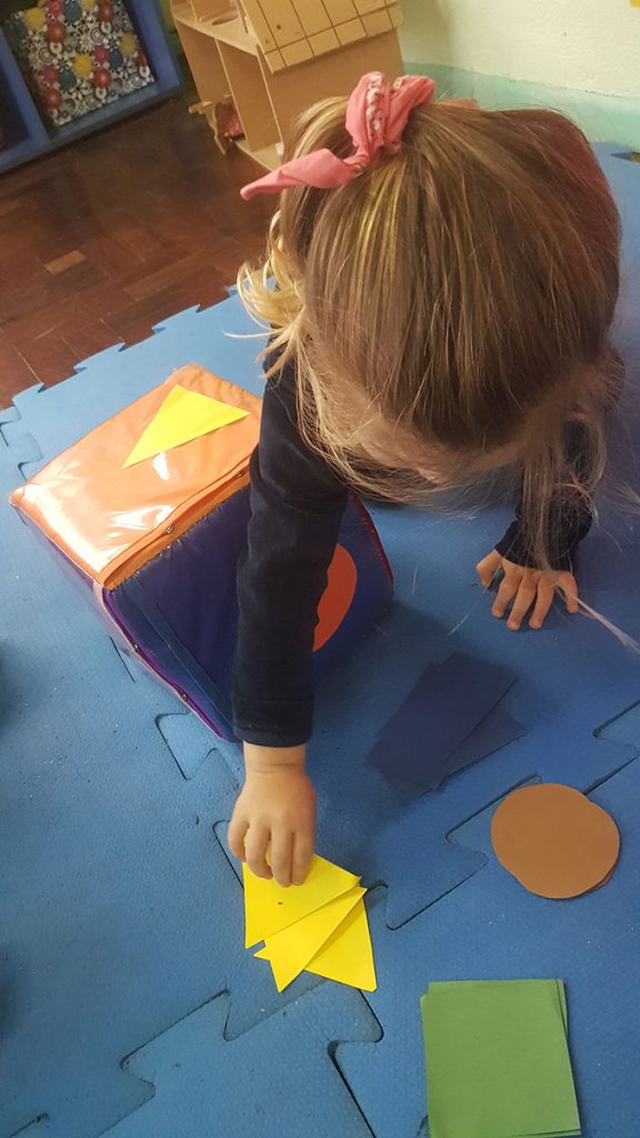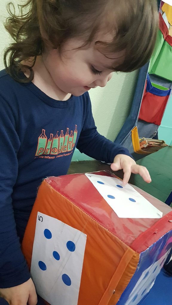 No minigrupo também encontramos diferentes formas de brincar com a matemática, como por exemplo: jogos de quebra-cabeça, memória, figuras geométricas, cores e números. Todos os jeitos as crianças desenvolvem a atenção e o raciocínio lógico, podendo classificar e seriar os objetos, realizar a correspondência termo a termo, contar oralmente e quantificar, da mesma forma que expressar suas ideias enquanto exploram.