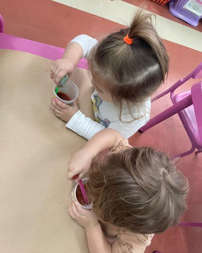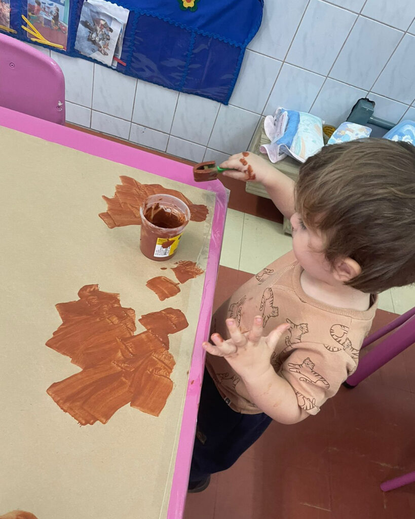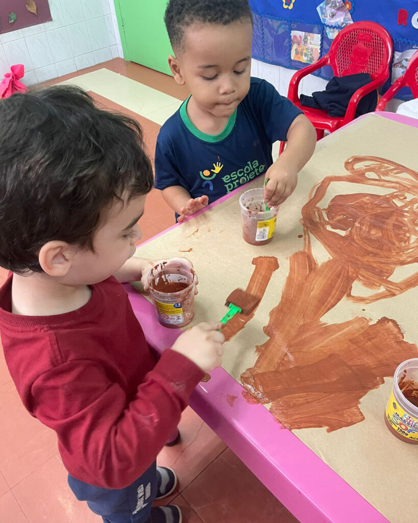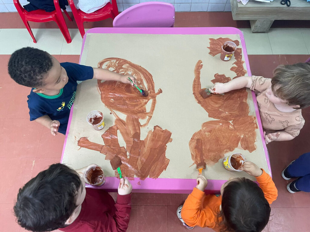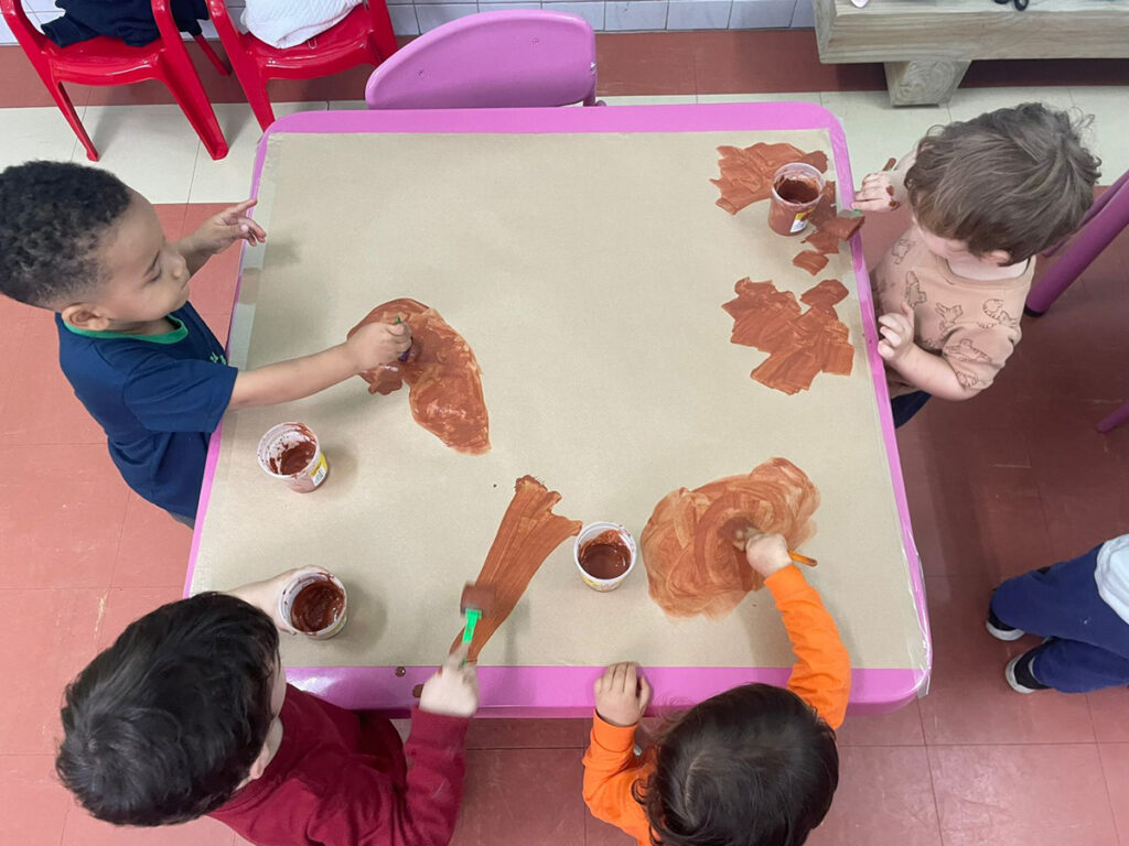 Com a proposta de experimentar possibilidades de usar a argila para pintar, as crianças foram incentivadas a misturar a argila com água e observar a transformação. Essa vivência foi tão interessante, que a turma não queria mais parar de pintar.