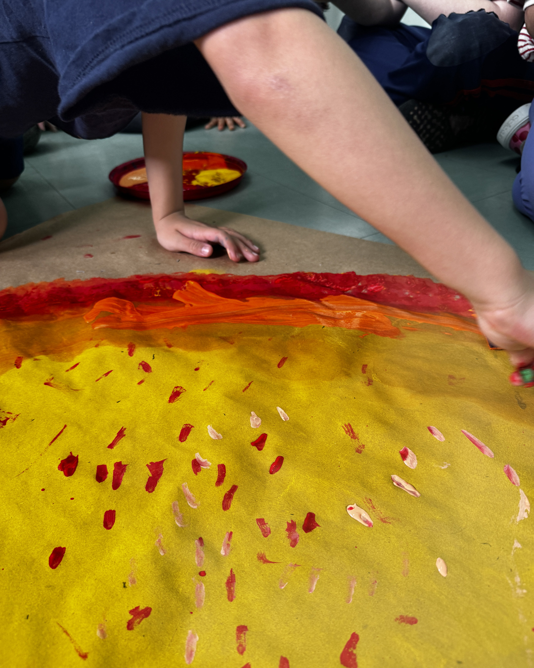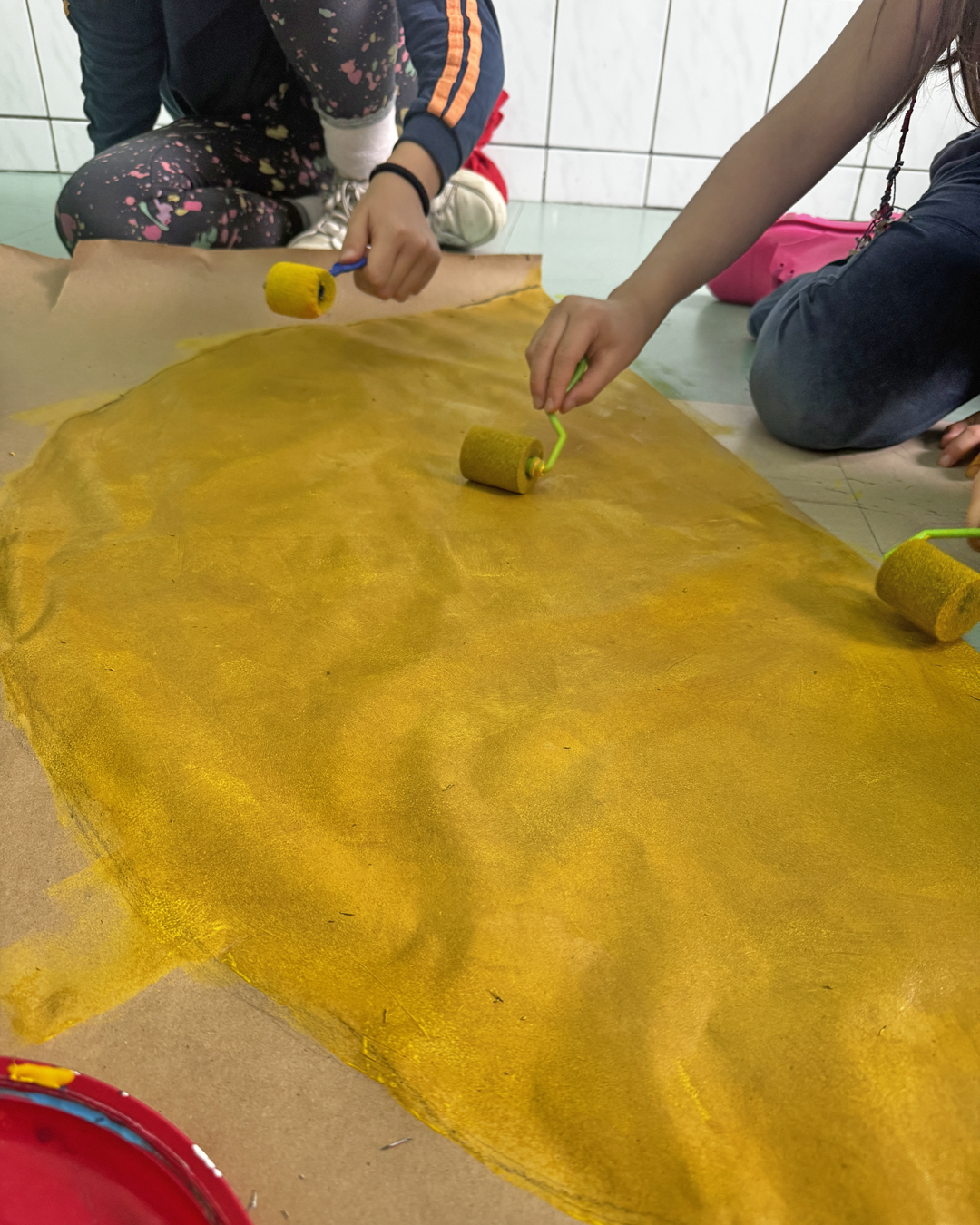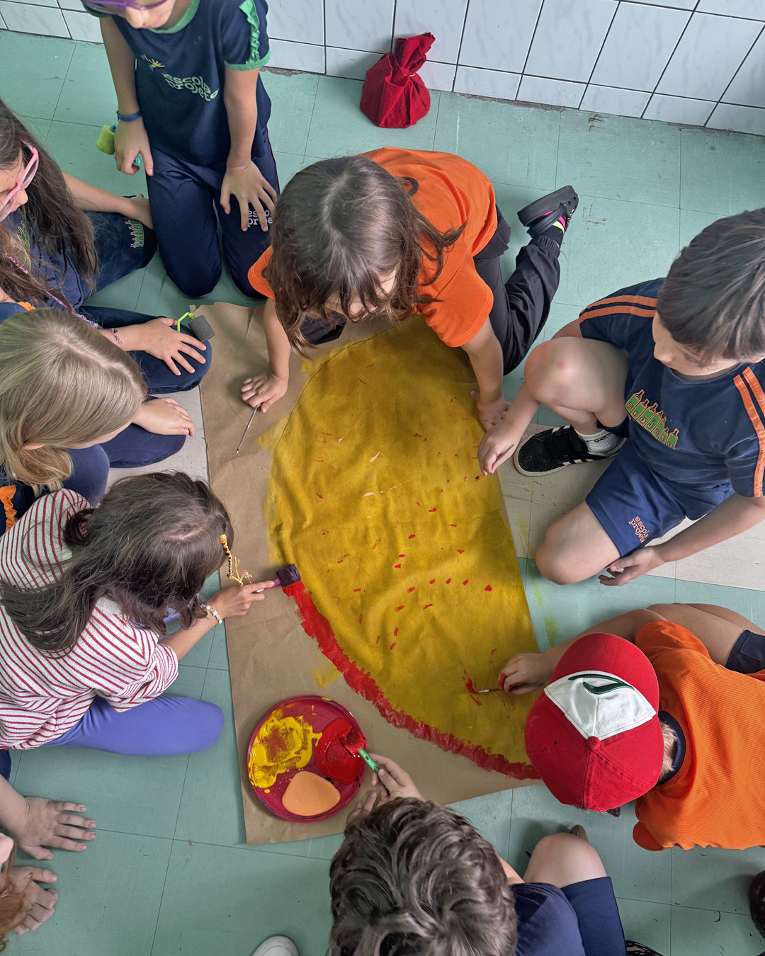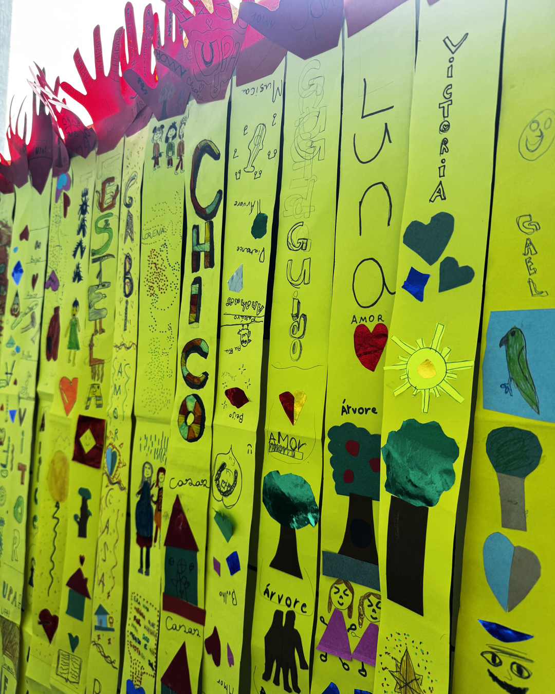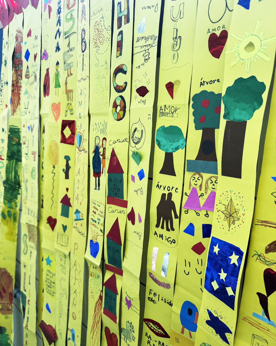 A atividade, inspirada na música Estrada do Sol e na versão do grupo UPA, convidou as crianças a refletirem sobre acolhimento. Cada uma produziu uma tira amarela representando seu “caminho até o Sol” e registrou palavras de acolhimento no contorno das próprias mãos. As produções foram reunidas em uma cortina coletiva que simboliza união.